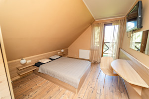 - Suchą saunę opalaną drewnem - najlepiej smakuje jesienią, gdy prosto z sauny wskoczyć można do lodowatego jeziora. Latem polecamy zimny prysznic po seansie saunowania.